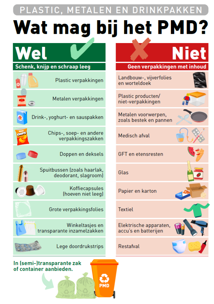 Let op: etensresten en landbouwfolie mogen nog steeds niet bij het PMD. Benieuwd wat er precies bij het PMD mag? Bekijk het overzicht hieronder!