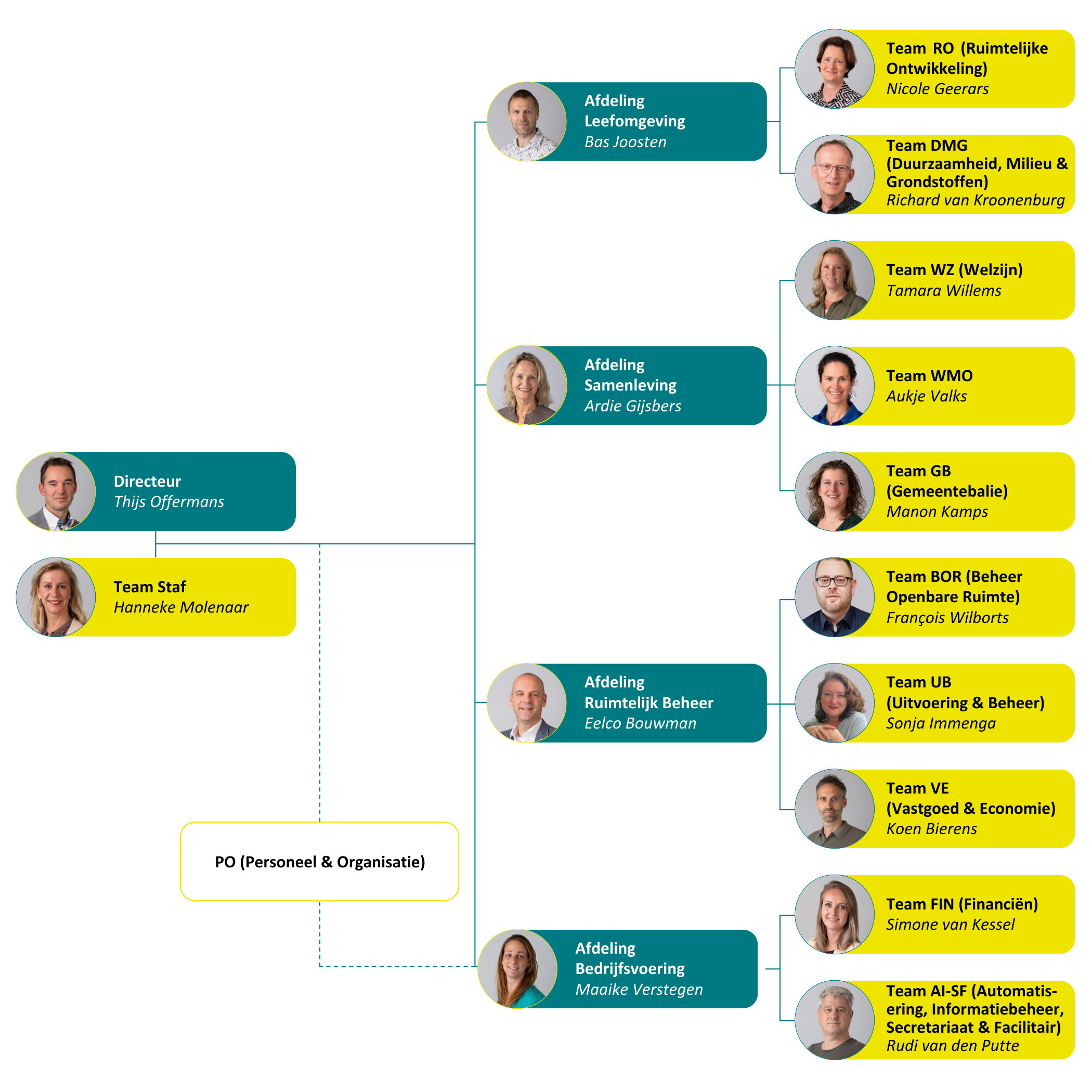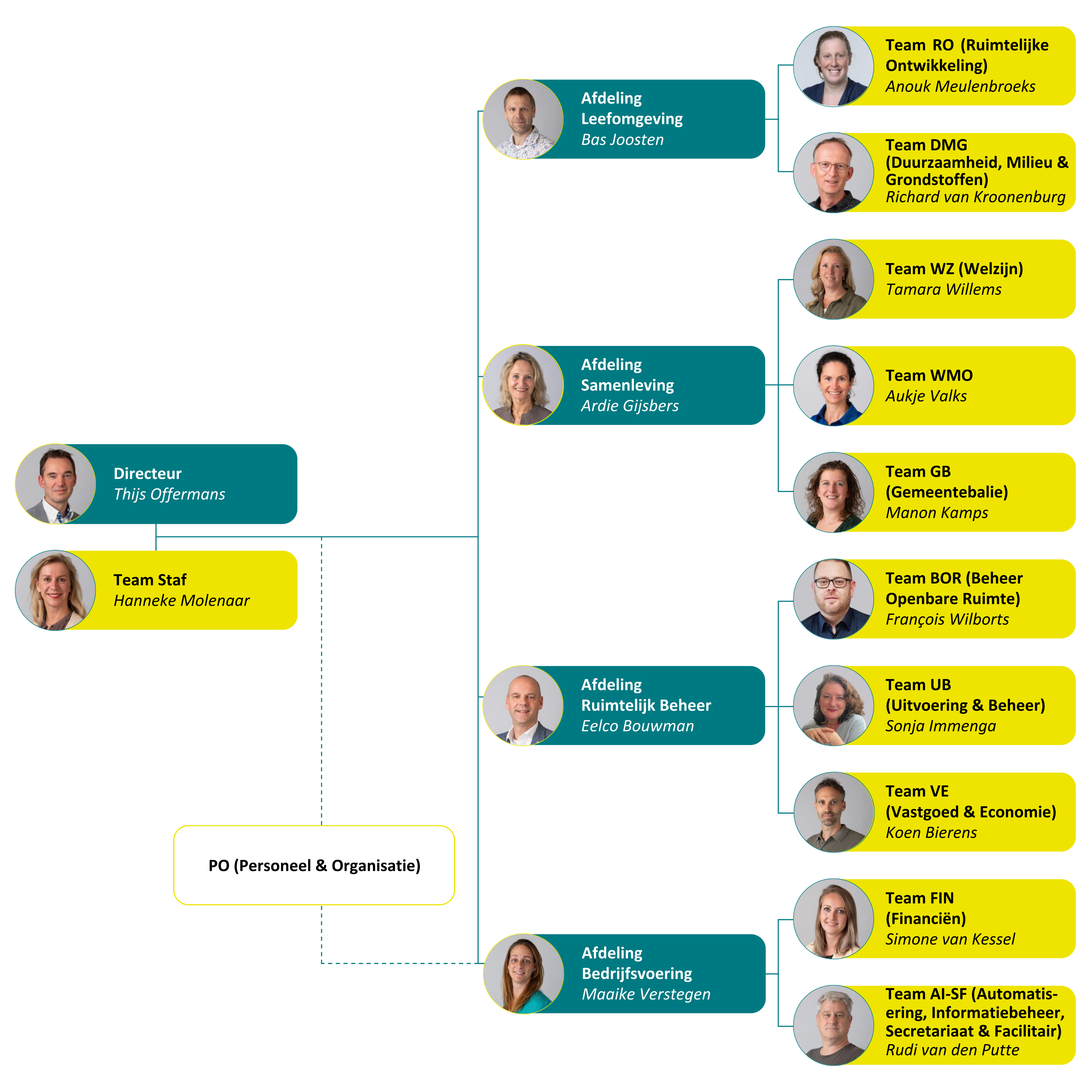 Onze organisatie bestaat uit een staf, 4 afdelingen en 10 teams.